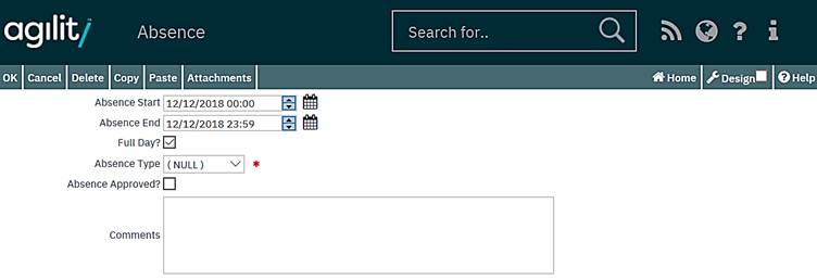 This is a drop down list enabling the selection of the type of absence. By default, these options are Holiday, Sickness or Training. However, further absence Types can be defined (please refer to the Absence Types section within this document)