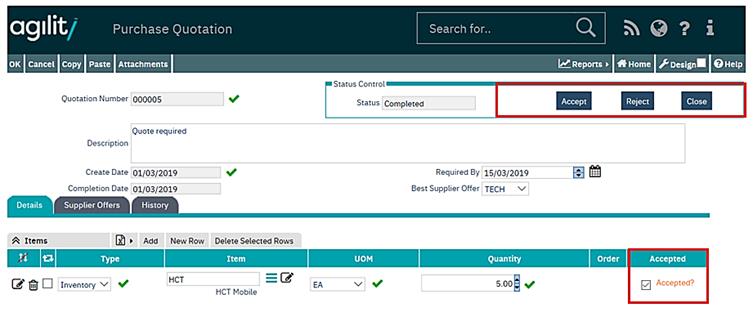 Completed quotation can either be accepted for order or rejected by using one of the buttons in the status control section of the quotation form:
