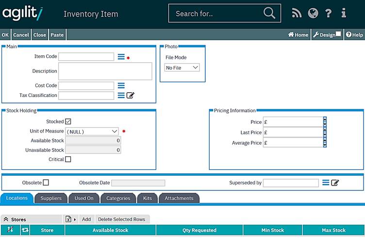 The Average Price field records the average price of the inventory item. This is automatically populated when goods are received into stock.