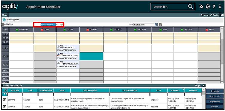 In schedule day mode the view is much the same as the daily scheduler where each labour resource occupies a column and the planner grid looks at a single day with time slots on each row.