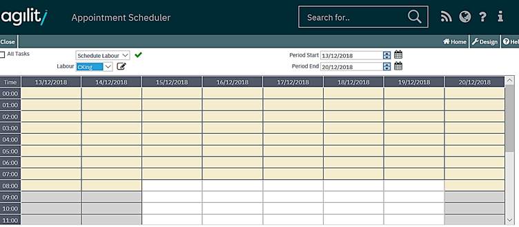 In labour mode the grid changes to focus on a single labour resource with each column representing a day within the selected date range and with time slots on each row.
