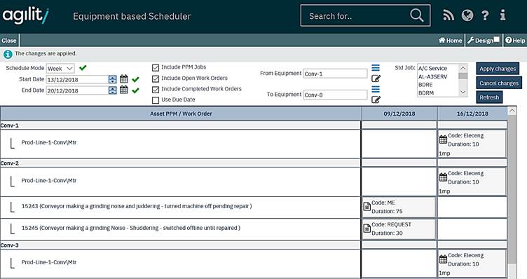 The grid displays equipment items down on each row and dates for each time interval. The time intervals can be selected by selected the ‘Schedule mode’ from the drop down list.