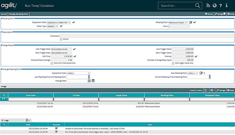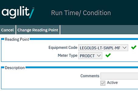 The change reading box allows a reading point to be changed for a different one but still maintain the run time history for the equipment item to which the reading point has been associated.