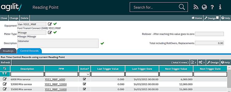 Multiple control records can be held against each reading point allowing the generation of PPM jobs on different cycles.