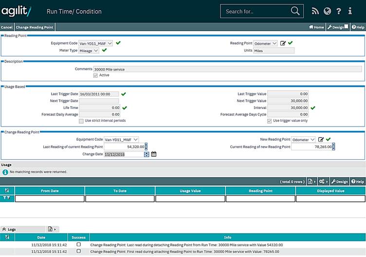 The change reading box allows a reading point to be changed for a different one but still maintain the run time history for the equipment item to which the reading point has been associated.