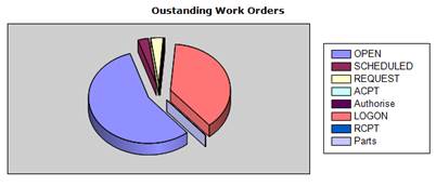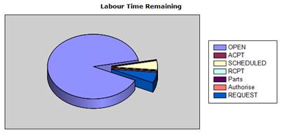 The second section of the report displays 2 charts. The first is a graphical representation showing a count of outstanding work orders by work order status and the second shows the sum of the labour time remaining by work order status