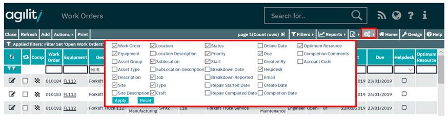 A menu will be displayed listing the columns available for the current scan form. Each column has a check box which shows or hides the column.