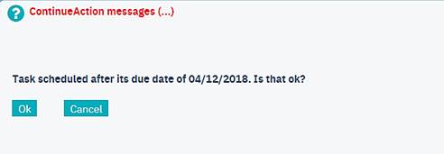 At this point it is necessary to resolve the query before any further scheduling can take place. Clicking ok will continue with the attempted action. Clicking cancel will cancel the attempted action.