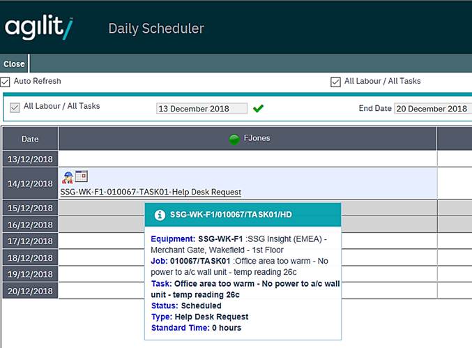 If the mouse is moved over an allocated task a summary of the task details is displayed as a tooltip.