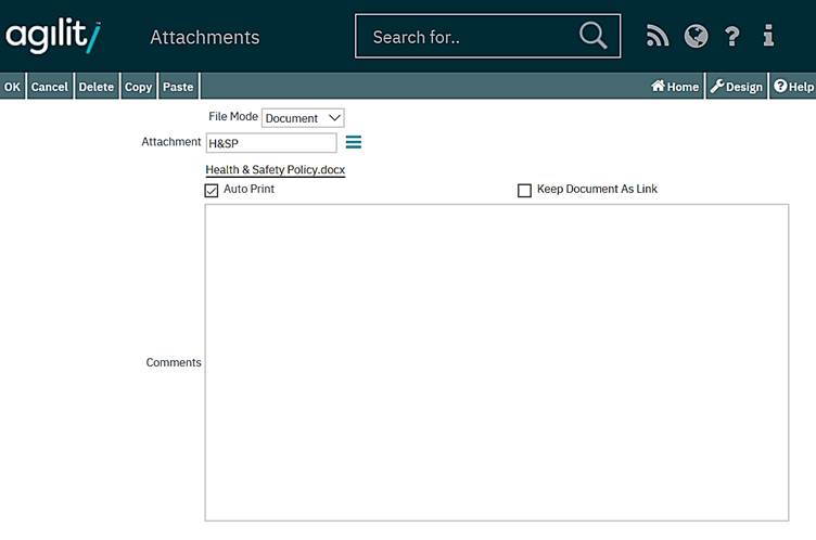 If this attachment is one that is required to be printed along with a Work Order then the ‘Auto Print’ box should also be checked. This will ensure that each time a work order is produced and printed against the currently selected item; this specific document will be printed automatically.
