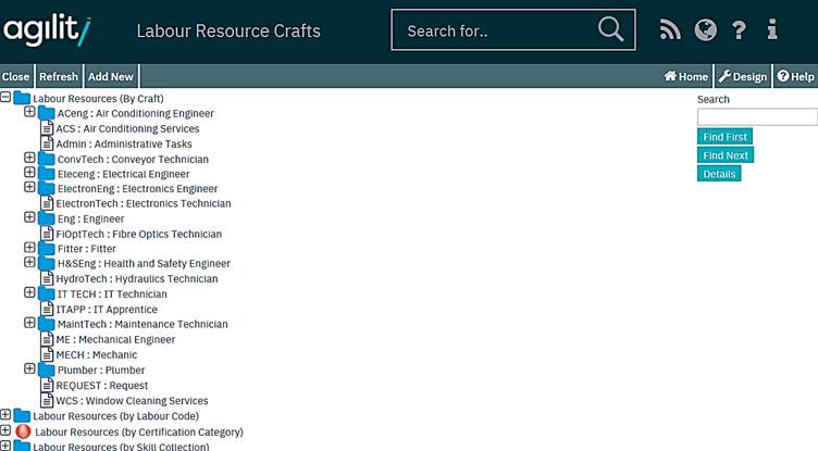 The Labour Resource Tree View shows all available labour (those defined as both Current and not temporarily unavailable) in a tree structure format. This includes two views of labour resources: one grouped by craft and the other showing labour resources by Labour Code.