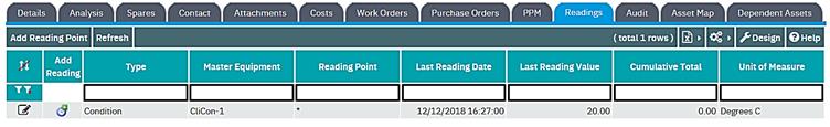 Readings Tab allows viewing or entering new readings for any meter defined for the viewed equipment. See section for the details about using meters in Agility.