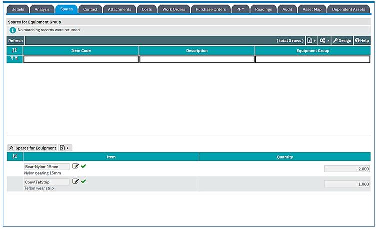 The spares tab shows all the inventory items that are used on the equipment item and asset group:
