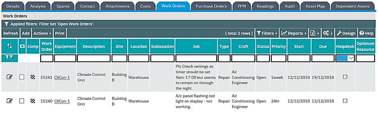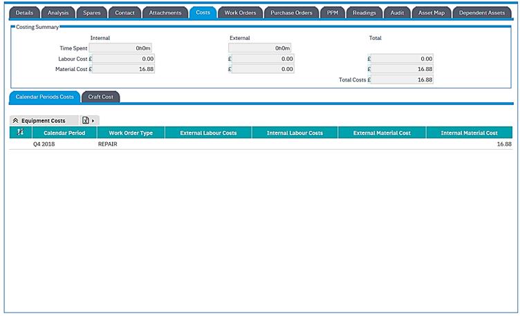 When enquiring on existing equipment, the following additional tab folders will be available: Spares, Costs, Work Orders, PPM Schedules.