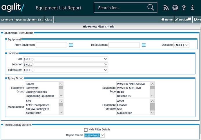 The equipment filter, a common element amongst many equipment based reports allows equipment rages to be selected for the report based upon the following criteria.
