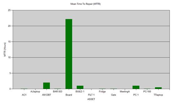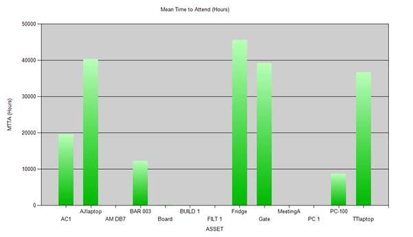 It can be seen from the MTBF chart that the item ‘AC1’ breaks down quite regularly, on average every ten days. However looking at this item on the ‘time to repair’ chart shows that it does not on average take long to repair and likewise using the ‘time to attend chart’ it can be seen that it doesn’t take long to get to the job.