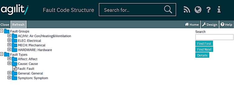This tree view provides a hierarchical structure view of the Fault Groups with underlying Fault Codes and the fault types with underlying fault code instances where the type is used.