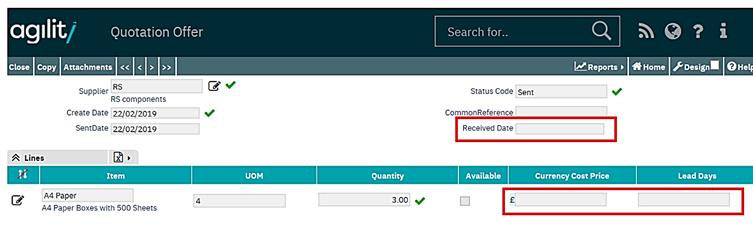 When all suppliers responded to quotations with their offers, the information needs to be entered back into the quotation document.