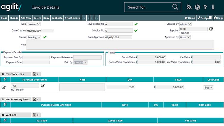 The system record details of all invoices received from suppliers so that they can be checked and approved for payment.