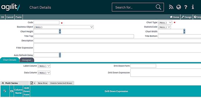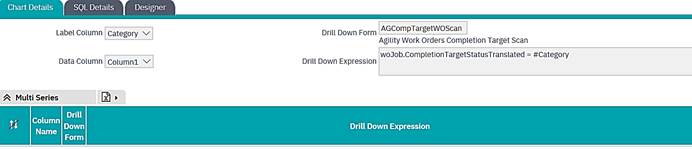 This grid has been provided to allow definition of multiple data series within a single KPI. 3 fields Column Name, Drill Down Form and Drill Down expression can be specified for each data series. |