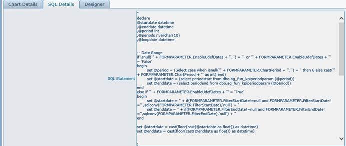 This tab is only visible when SQL Chart Type has been selected in the KPI header. The contents of the field should be a valid string expression, which evaluates to the valid SQL statement. The example contents of the SQL Details field are shown on the screenshot below.