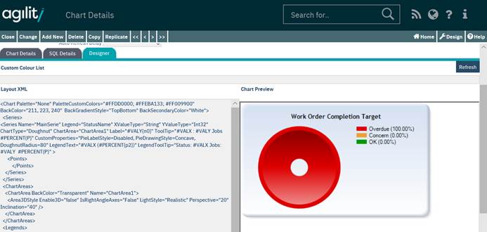The designer tab allows you to specify the details of the graphical layout of the Chart in the form of a well formatted xml file. The Chart Preview area shows the Chart image according to the current settings for the data source, drill down definition and the layout defined. The syntax and possible options within the Layout XML field should only be altered by advanced users after appropriate training, and the details are out of the scope of this help document.