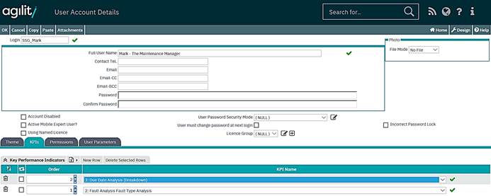 Leaving this grid blank means that the user will not see any KPI Graphs. In Agility version 5 and above, these are often hidden behind the “dashboard” (or indeed any other form that has been set to display instead). See the “Menus” topic for details on how to enable viewing of these KPIs.