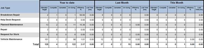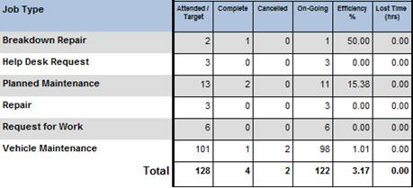 It also highlights potential efficiency problems between job types, looking at the sample figures below breakdown repairs are being dealt with at around 50% efficiency but planned work is only 15.36% and the cause of why this efficiency figure is so low should be looked into.