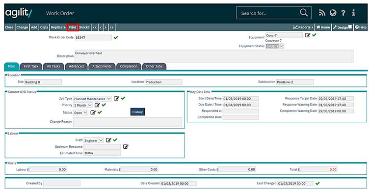 There are 2 main areas within the system that work orders can be printed from. The single currently viewed work order can be printed from the work order detail form, using the report menu within the page header.