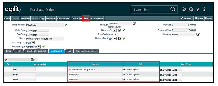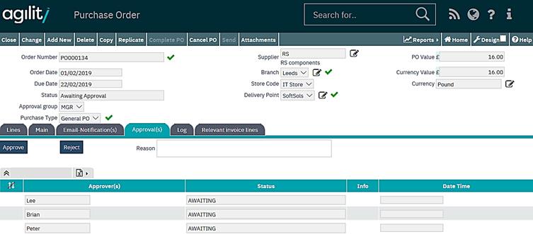 The purchase order detail form can be accessed from any purchase order enquiry form but the ‘Awaiting Approvals’ form is specifically designed to return a pre-filtered scan form of orders awaiting approval.