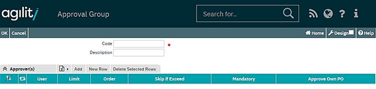 Next approval group members are added to the ‘Approver(s)’ grid. The group must contain at least one member. A member must be a pre-defined Agility user.