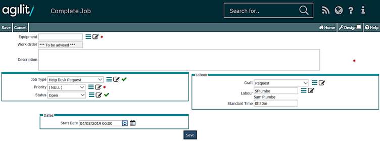 Once all the details have been entered then the save button should be clicked to create the work order and assign a job code.