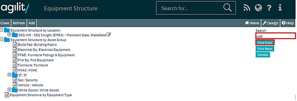 Tree View forms offer the functionality to search for records within the Tree Structure. This is a free text search facility, so will retrieve all records which contain the search string in the Tree Header Codes (in the example of the Asset Tree Structure this would search the Site Code, Location Code, Sub Location Code or Asset Code).
