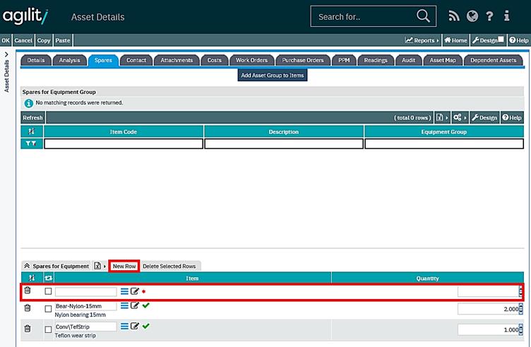 To add further Inventory Items to this asset, the first thing to do is click “Change” at the top of the form, and then in the Spares for Equipment section click “New Row” (as illustrated below). You can then select any available Inventory Item, and specify the quantity required.