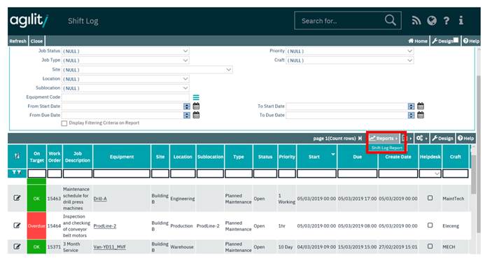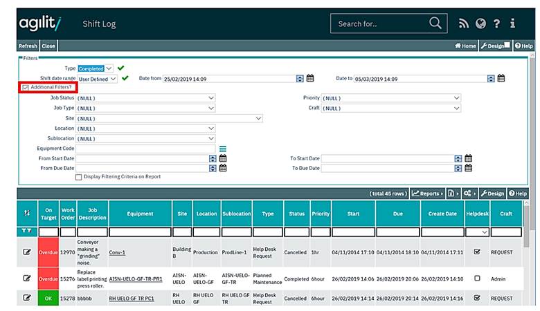 The shift log report is a summary list of work orders which have been created, completed or amended during the defined period of the report.