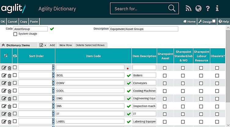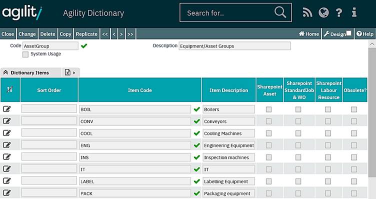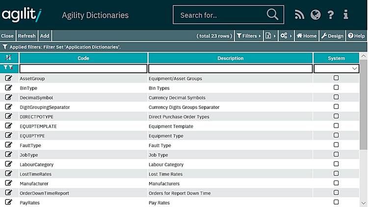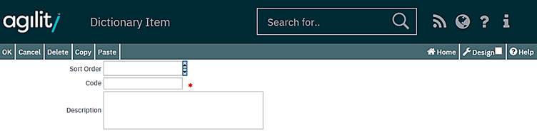 The Single Dictionary is used for system default lists such as Lost Time Codes and Travel Codes and also used for defining any customised list, to contain a code and a description, which is required as a source for a lookup on a data entry field.