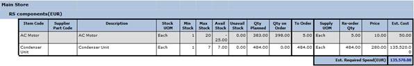 It contains data on current stock levels and projected stock demand with the quantities and costs required to meet the required stock level.