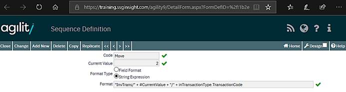 If the Sequence Code is defined as “Move.[StoreCode].[TransactionCode]”, (e.g. Move.General.Issue), then this sequence would be used only for movements for issues from the general store.