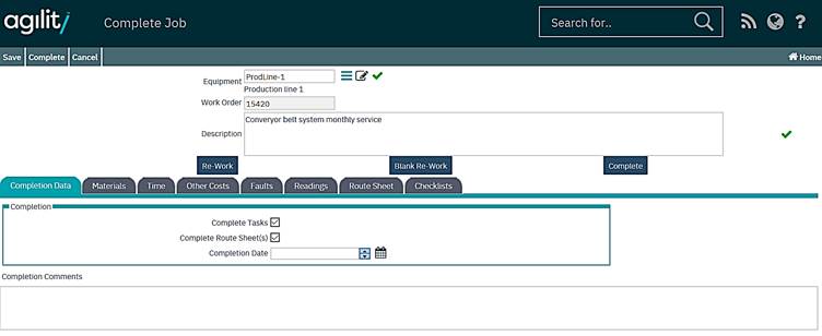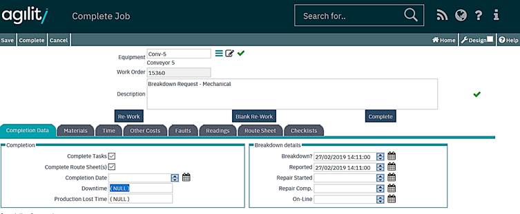 The completion data tab contains the main completion data about the job, times, comments and breakdown details if the work order was of a break down job type.