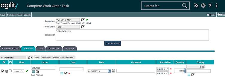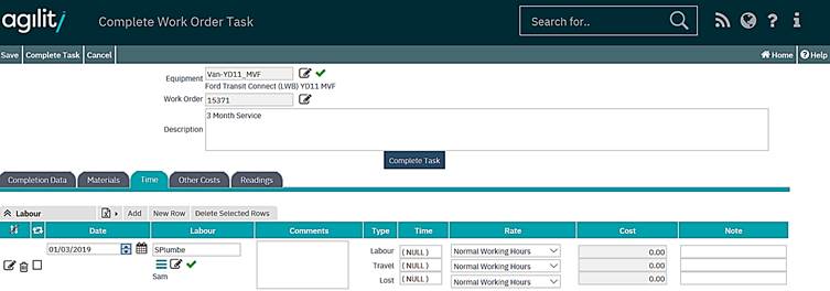When the completion form opens the top portion of the form contains pre-populated work order data. The lower portion contains a series of tabs for the recording of transactions against the first or main task on the work order.
