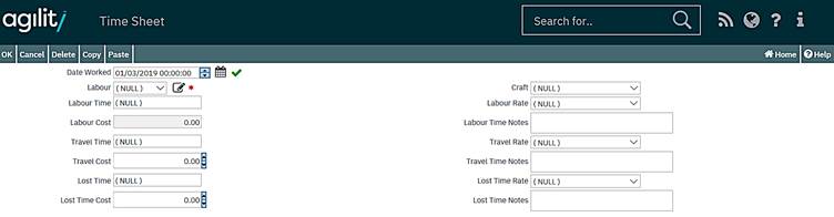 The Labour can be selected from the help scan or entered manually. This represents the Labour Resource against whom time is to be logged against. This does not have to be the Labour Resource who to whom the task was originally scheduled. Multiple time transaction for different or the same employees can be added.