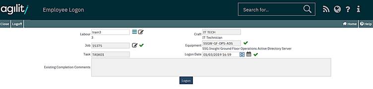 Work Order Logon/Logoff functions are provided to easily mark the Work Order and task the employee is currently working on. Once the Work Order or task is completed or suspended, employee can easily log off the currently assigned Work Order. Logon/Logoff automatically creates a labour transaction record and calculates the cost based on the time between logon and logoff actions.