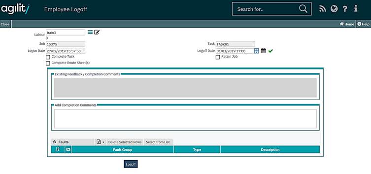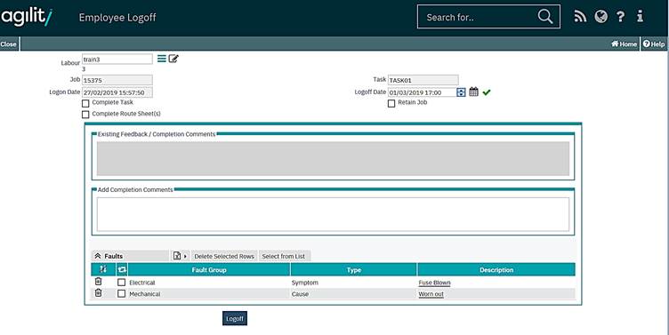 The log off form also contains a grid when any fault code can be additionally recorded prior to logging off. Any faults recorded here will be recorded against the work order.
