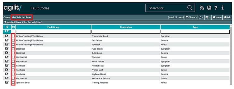 Once the selection has been made click the ‘get selected rows’ option to return the selected rows back to the grid.