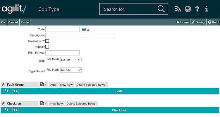 Checklists can be added when creating a new Work Order type or added to existing Work Order types using the change function. To add a checklist, click the ‘New Row’ button on the checklist grid on the detail form of the Work Order type.