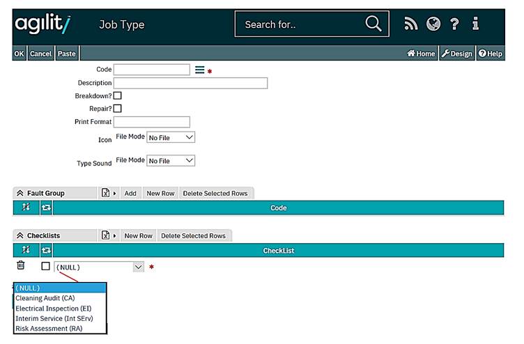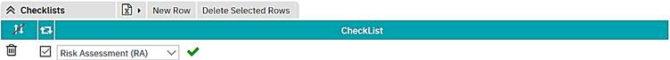 This will create a new row in the grid, from the drop down list of available pre-defined checklists, select the required item. Repeat this process until all required checklists have been added.